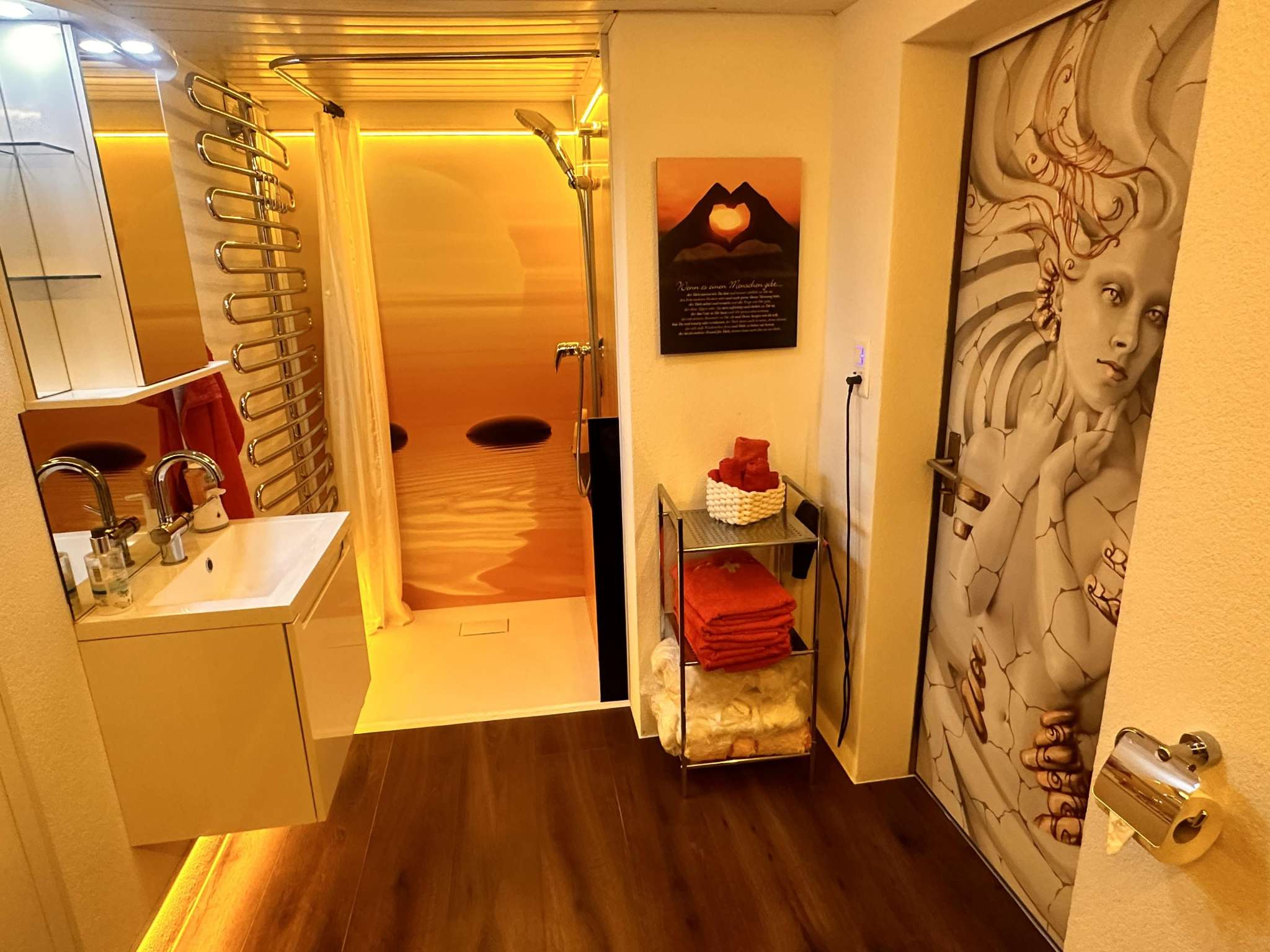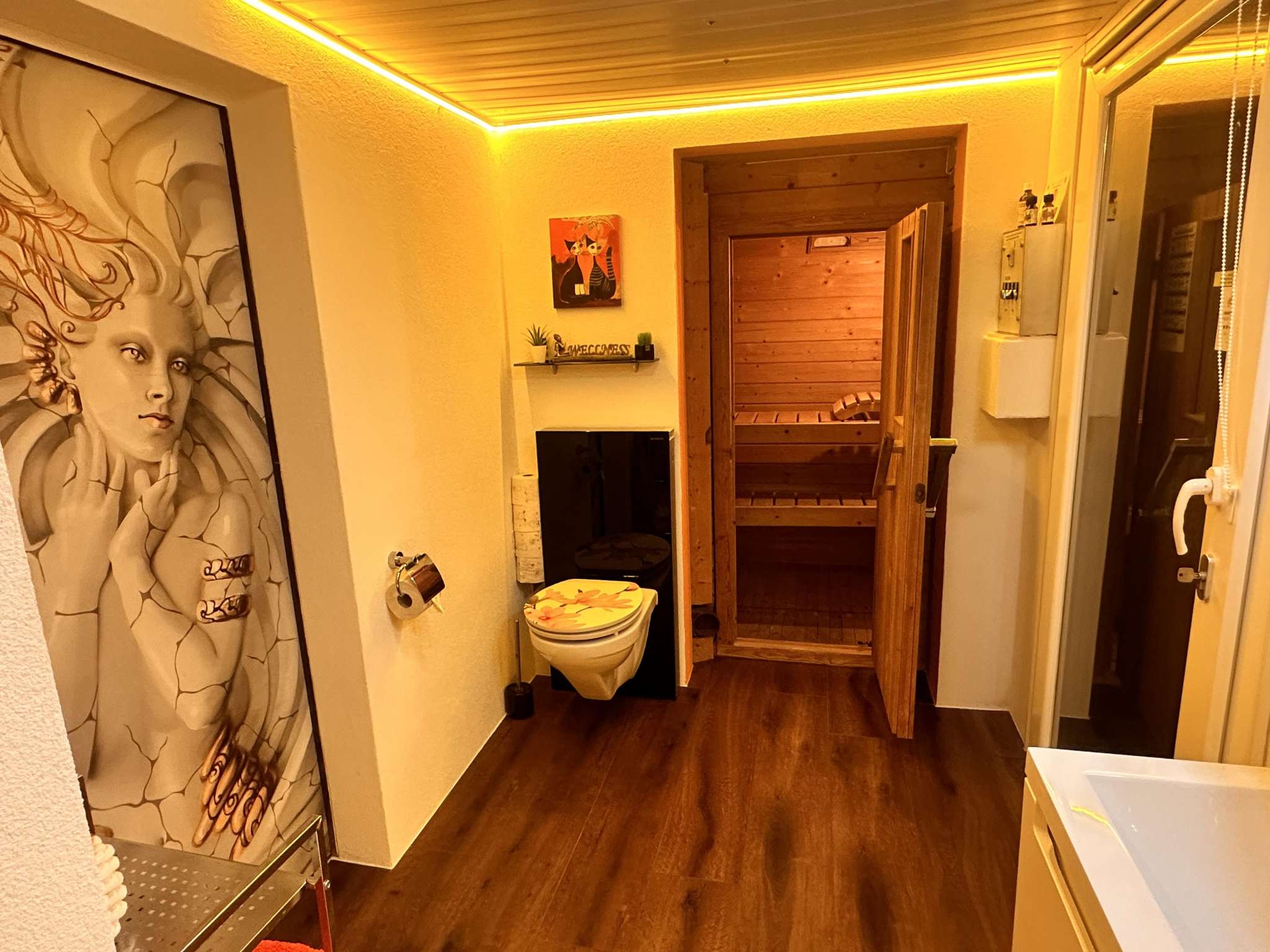 Dusche, WC, Lavabo und eigene Finnische Sauna.
